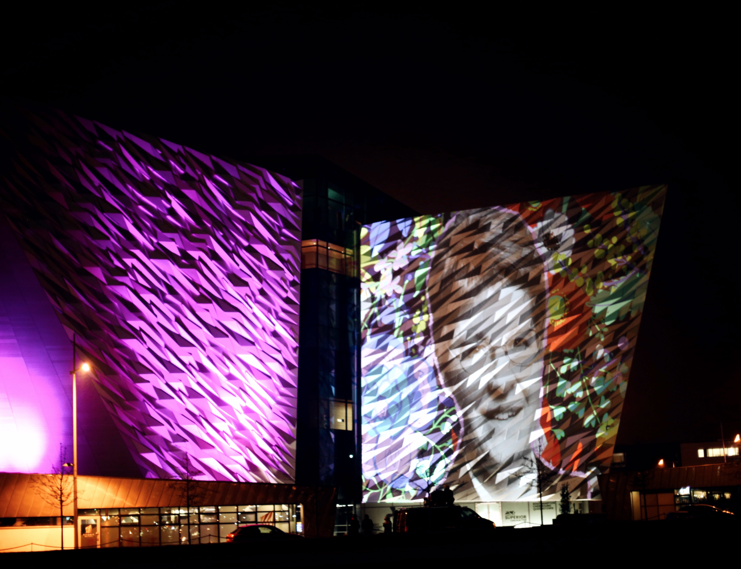 The iconic Titanic Museum aglow with astrophysicist Dame Jocelyn Bell Burnell.